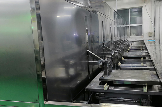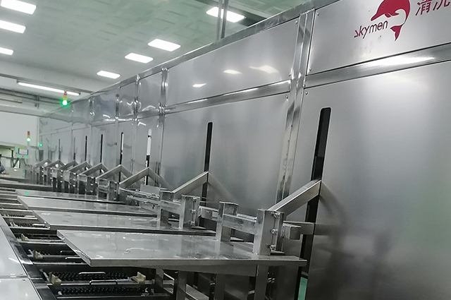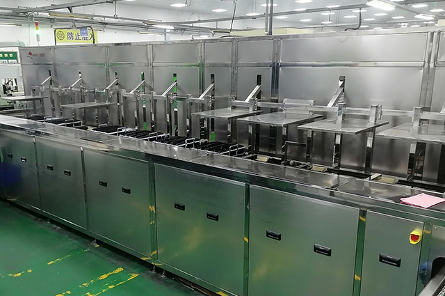 上料→高壓噴淋清洗→超聲波清洗→超聲波清洗→高壓噴淋清洗→超聲波漂洗→超聲波漂洗→超聲波漂洗→風(fēng)切吹水→離心甩干→熱風(fēng)干燥→熱風(fēng)干燥→下料